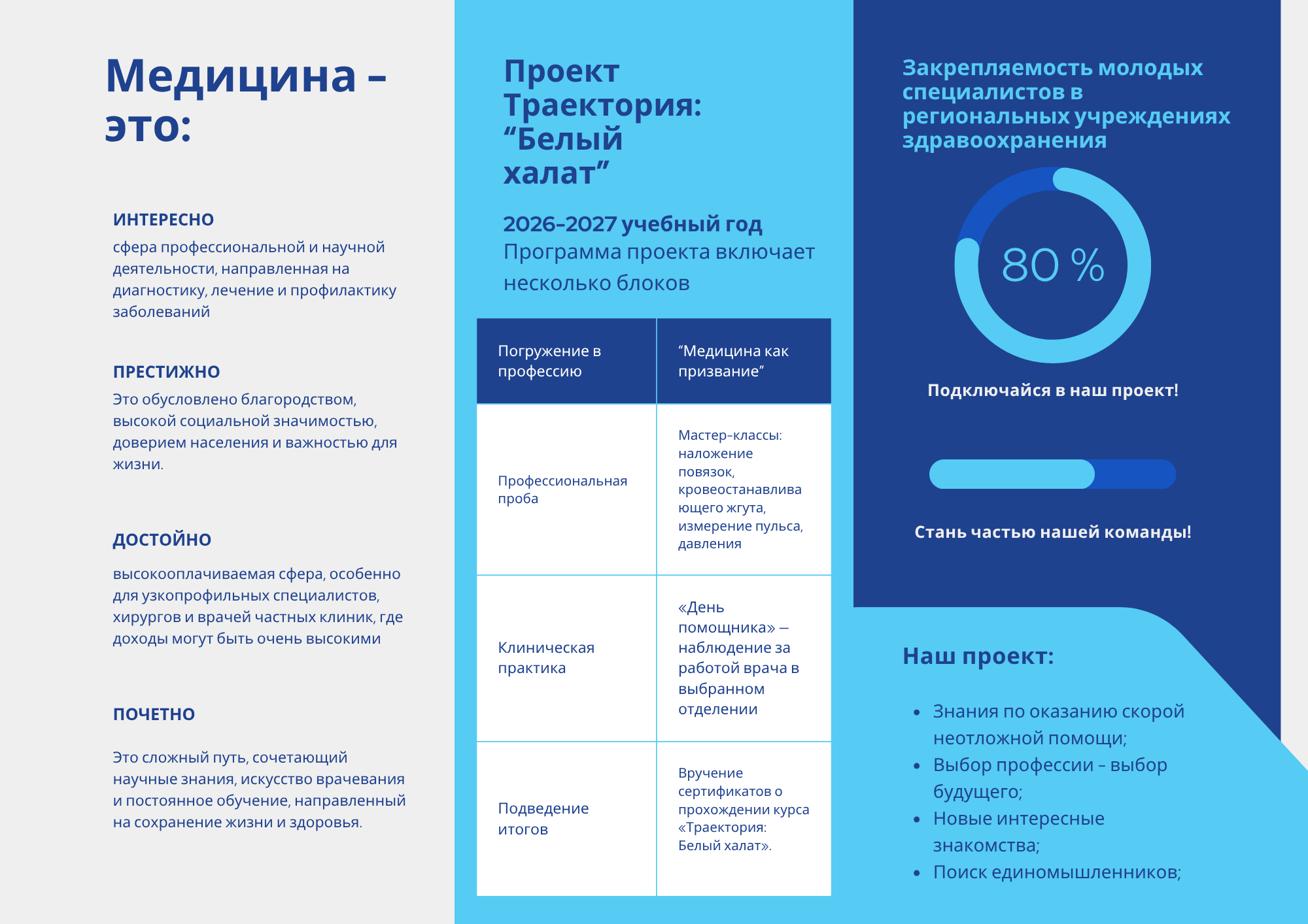 Данный проект призван решить проблему нехватки медицинского персонала в местных больницах и поликлиниках. Для этого он помогает старшеклассникам (с 9 по 11 класс) осознанно выбрать медицинскую профессию. Поскольку сейчас в Беларуси медицинское образование в основном готовит специалистов под конкретные нужды, будущим студентам особенно важно заранее узнать, как устроена работа в медицине. Основная задача проекта — обеспечить постоянный приток мотивированных специалистов в медицинские учреждения. Это делается с помощью профориентации, когда можно попробовать себя в профессии на практике.