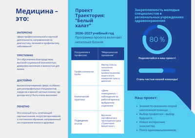 Таким образом, проект отвечает на реальный запрос: помочь старшеклассникам сделать осознанный выбор медицинской профессии, понять её трудности и преимущества до того, как они подпишут целевой договор и сядут за студенческую скамью. А также сформировать кадровый резерв на ближайшие годы.