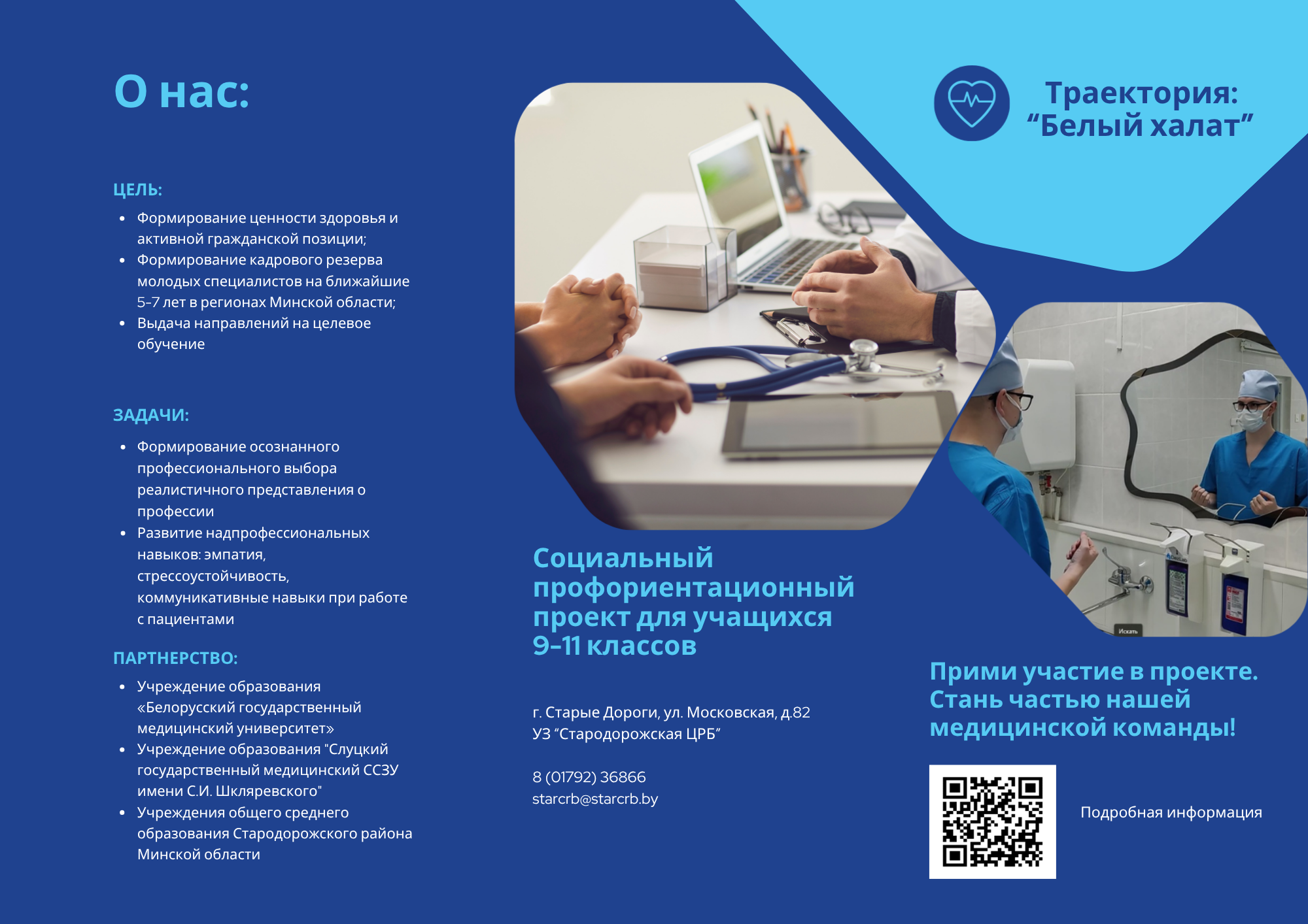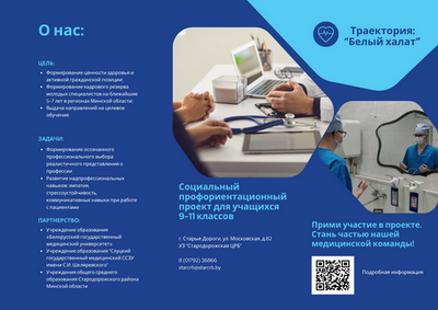 Данный проект призван решить проблему нехватки медицинского персонала в местных больницах и поликлиниках. Для этого он помогает старшеклассникам (с 9 по 11 класс) осознанно выбрать медицинскую профессию. Поскольку сейчас в Беларуси медицинское образование в основном готовит специалистов под конкретные нужды, будущим студентам особенно важно заранее узнать, как устроена работа в медицине. Основная задача проекта — обеспечить постоянный приток мотивированных специалистов в медицинские учреждения. Это делается с помощью профориентации, когда можно попробовать себя в профессии на практике.